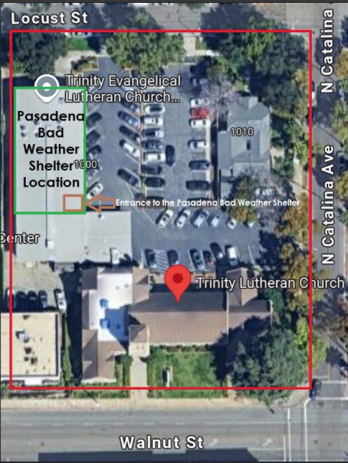 The snapshot below shows the location of Trinity Lutheran Church as well as the entrance to the Pasadena Bad Weather Shelter on the church property: